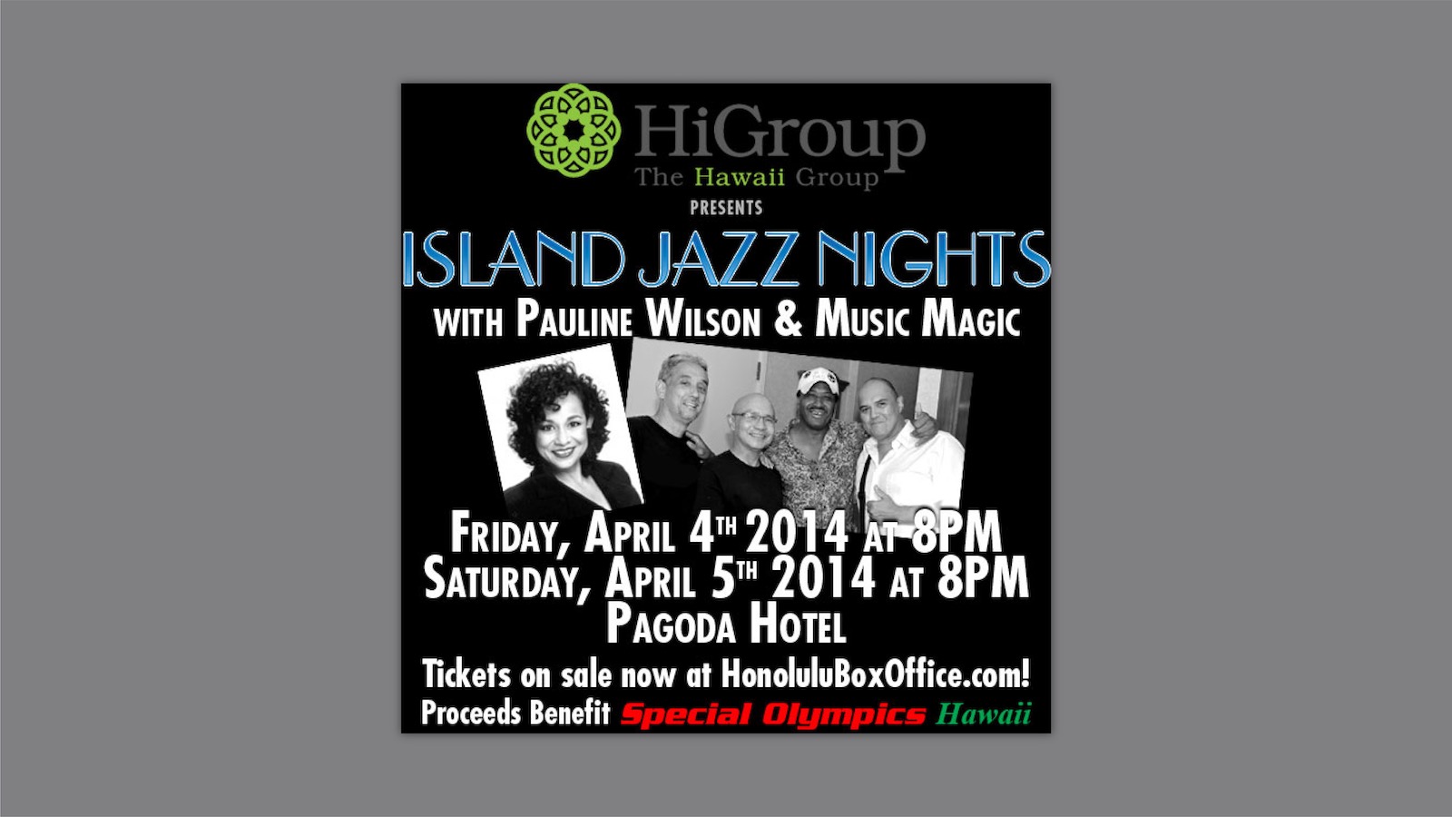 The Hawaii Group is proud to sponsor Island Jazz Nights with Grammy Award winning Pauline Wilson & Music Magic on April 4-5, 2014 at the Pagoda Hotel International Ballroom. Both shows will begin at 8:00 p.m. with proceeds benefiting Special Olympics Hawaii.